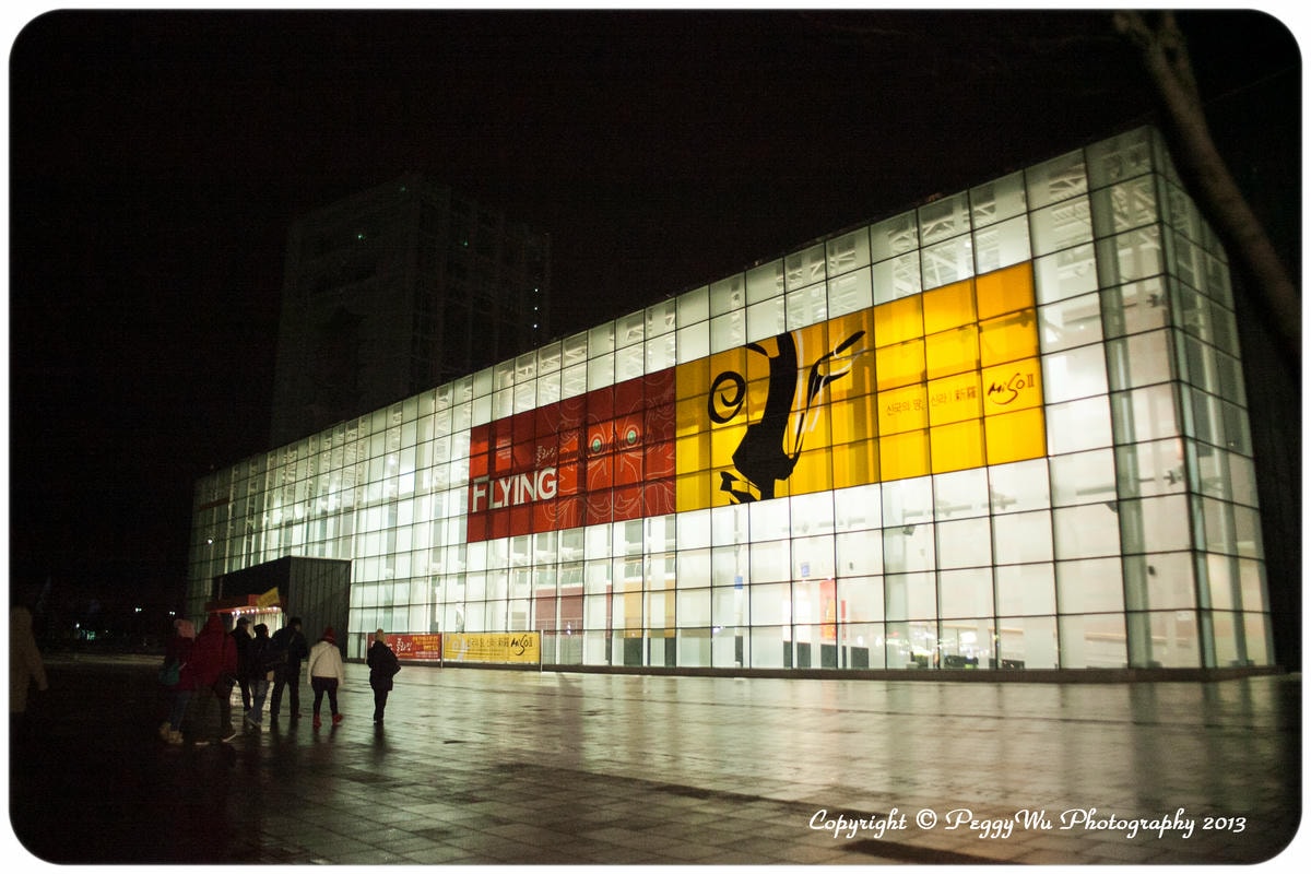 用完餐後 我們驅車前往慶州世界文化博覽會文化中心演出廳欣賞MISOII 這棟建築物還蠻美的 黑暗中就他閃閃發亮 內部的陳設顏色相當豐富 看了就令人心情愉悅 小荳拿著帥導遊夾給她的小兔兔拍照 很開心 服務台 正在做人數確認 等一下要進場了 無聊的時候連暖暖包都可以玩 準備進場囉 今天的戲碼是<<美笑2-神國之地,新羅…