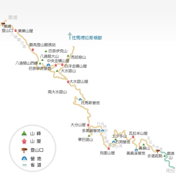 這是在網路google到的八通關古道地圖 相關的歷史資訊 可以在下列連結找到 這裡就不贅述囉!!! 八通關古道鹿鳴段 由南安瀑布在繼續往前行即可看到指示牌 由於指示牌告排指示鹿鳴步道入口只有0.5KM 基於探路的精神 我們就繼續給他走進去了 …